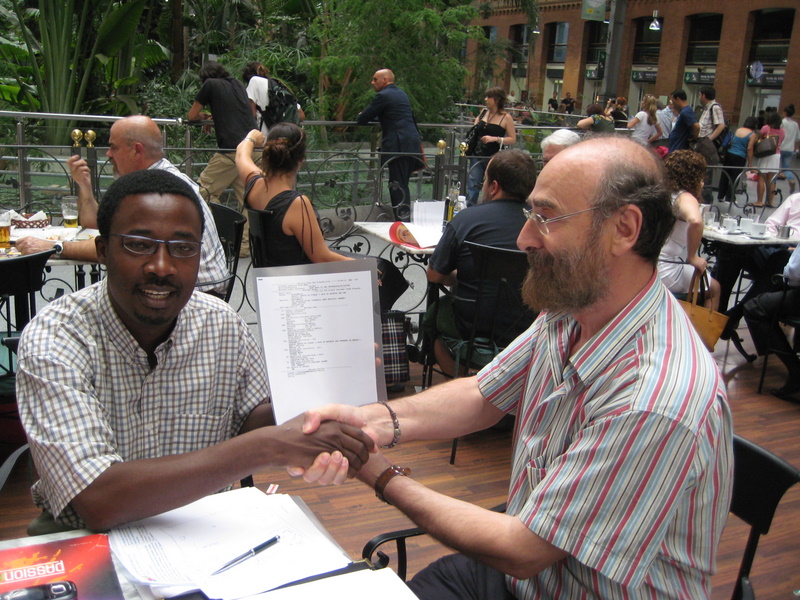 Aprovechando la estancia de Monsieur Théodore Soume en España, y como miembro del Consejo Director del Complejo "Leonard Goragui" en Benín, el Presidente de ASY, Fernando del Castillo, se trasladó a Madrid el 7 de junio de 2010 para conocerle personalmente y poder mejorar y completar la información que desde hace tiempo Acción Solidaria Ya! y la Fondation Vie Pour Tous vienen intercambiando. La conversación giró en torno al objetivo que ASY ha propuesto desarrollar a la Fondation Vie Pour Tous: la financiación del proyecto de construcción de una granja de gallinas, corderos y conejos en Sirarou (Benín -África Occidental-) para ayudar al mantenimiento y formación de las 20 mujeres que residen en la casa de acogida de Sirarou y en la que aprenden a tejer, peluquería y costura. El Presidente de ASY hizo entrega a Monsieur Théodore Soume del documento acreditativo de envío de los fondos presupuestados para la ejecución de este proyecto y Monsieur Théodore Soume invitó a los miembros de ASY a participar en Benín, durante el mes de septiembre próximo, en la celebración del quinto año que la Fondation Vie Pour Tous inició la creación de programas para la mejora de las condiciones de vida de los habitantes de la zona. |