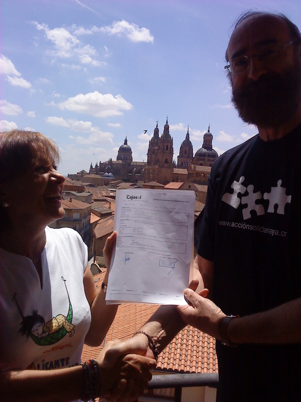 El Presidente de ASY hace entrega a la representante de Wopsec-Alicante, Dra. Inmaculada Hernández del documento bancario que acredita el envío de los fondos previstos para financiar los fármacos analgésicos y anestésicos de las operaciones quirúrgicas por un valor de 2.734'22 euros |
